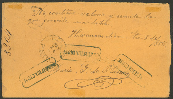 sent from Buenos Aires to Lima on 1/DE/1893 originally franked, with inscription on back, over the flap: "Taken from the mailbox showing signs of having had stamps and being dirty, J. Piñeiro," and for that reason it was forwarded to Lima with