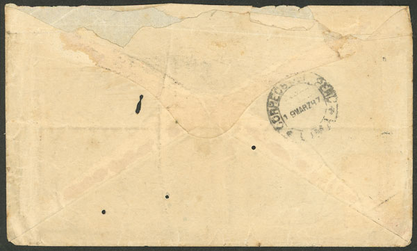Cover sent to Lima franked with 10c., straightline "AREQUIPA" cancel, on back arrival mark of 19/MAR/1887, with some small moth holes but of very fine appearance, rare! (Image) (Image-02)