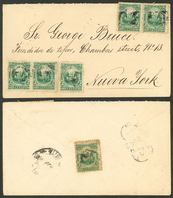 sent from Paita to New York in 1890 franked with 12c. (one stamp of 2c. on back), all the stamps killed by mute cancels, and on back a datestamp of Paita and arrival for 4/AU/1890, VF quality! (Image)