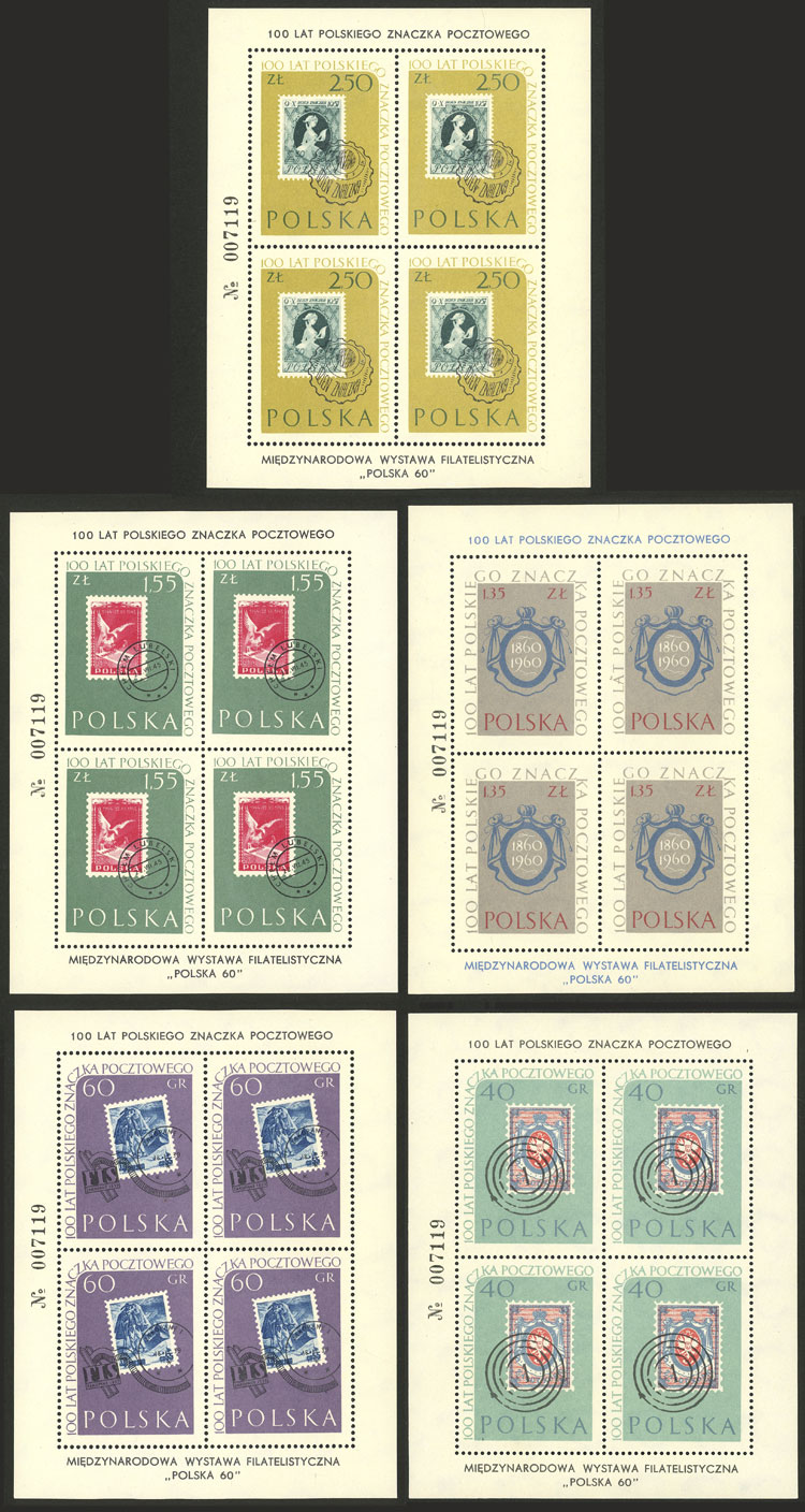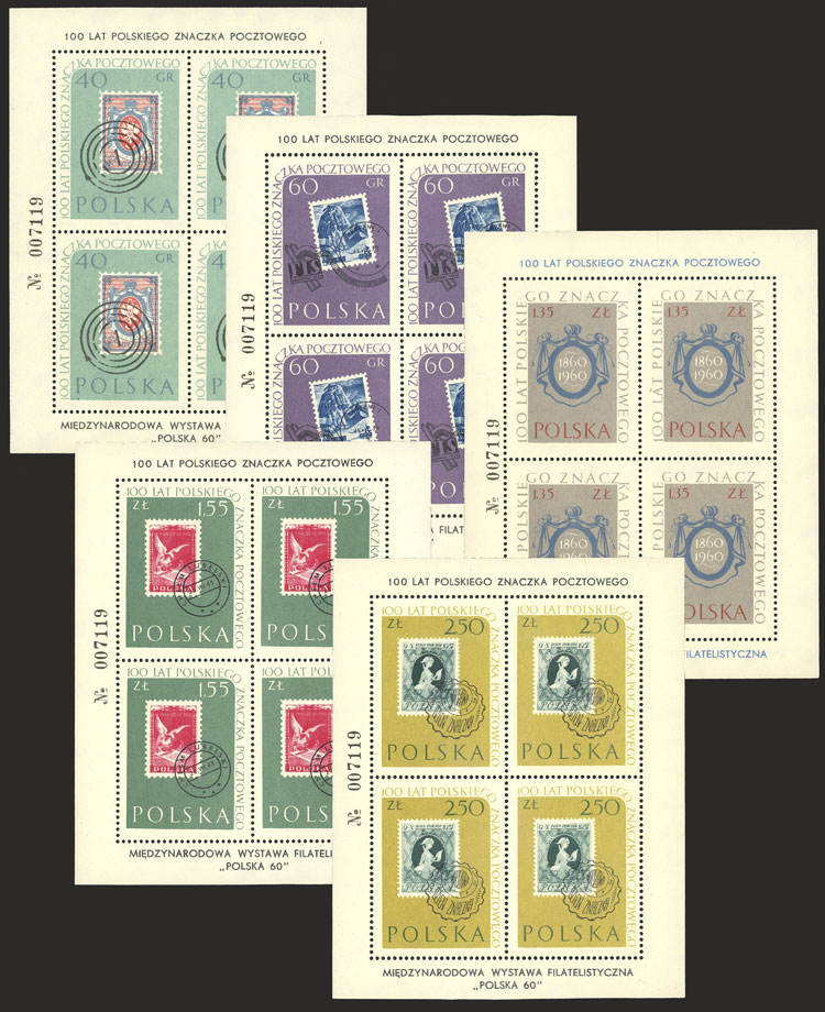 Sc.909/913, 1960 Centenary of the Polish stamp, complete set of 5 souvenir sheets with 4 values each, MNH and of excellent quality! (Image) (Image-02)