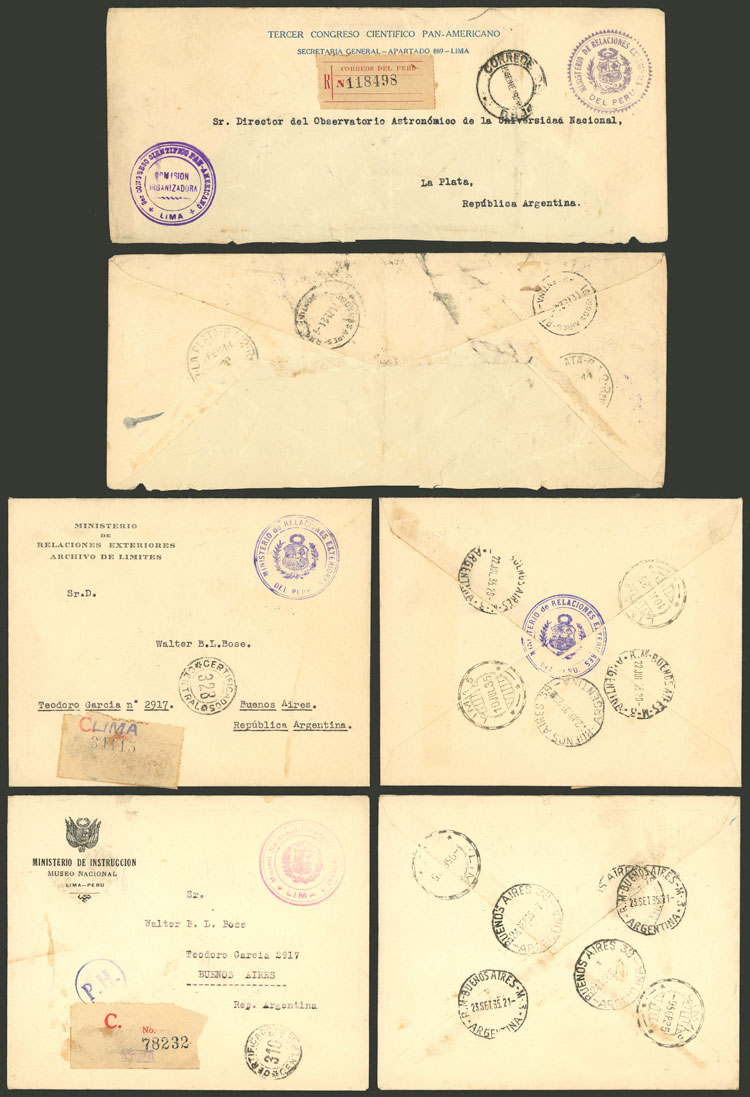 Registered covers sent to Argentina with postal franchise in 1924 (Pan-American Scientific Congress) and 1935 (x2, Ministry of Education and Ministry of Foreign Affairs), very interesting! ATTENTION: Please view ALL the photos of the lot, because all