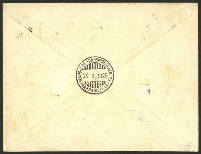 22/OC/1928 First flight Peru - Ecuador - Colombia, cover franked with 12c. definitives + airmail fee with SCADTA stamps overprinted "PE.", sent from Paita to Barranquilla (with arrival backstamp of 25/OC), very fine quality! (Image) (Image-02)
