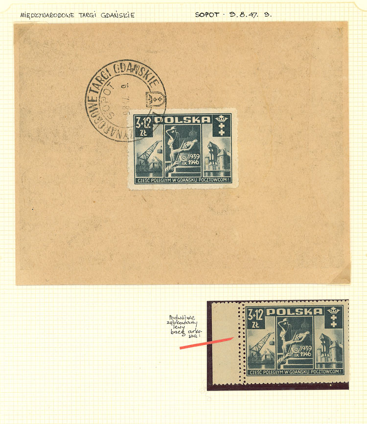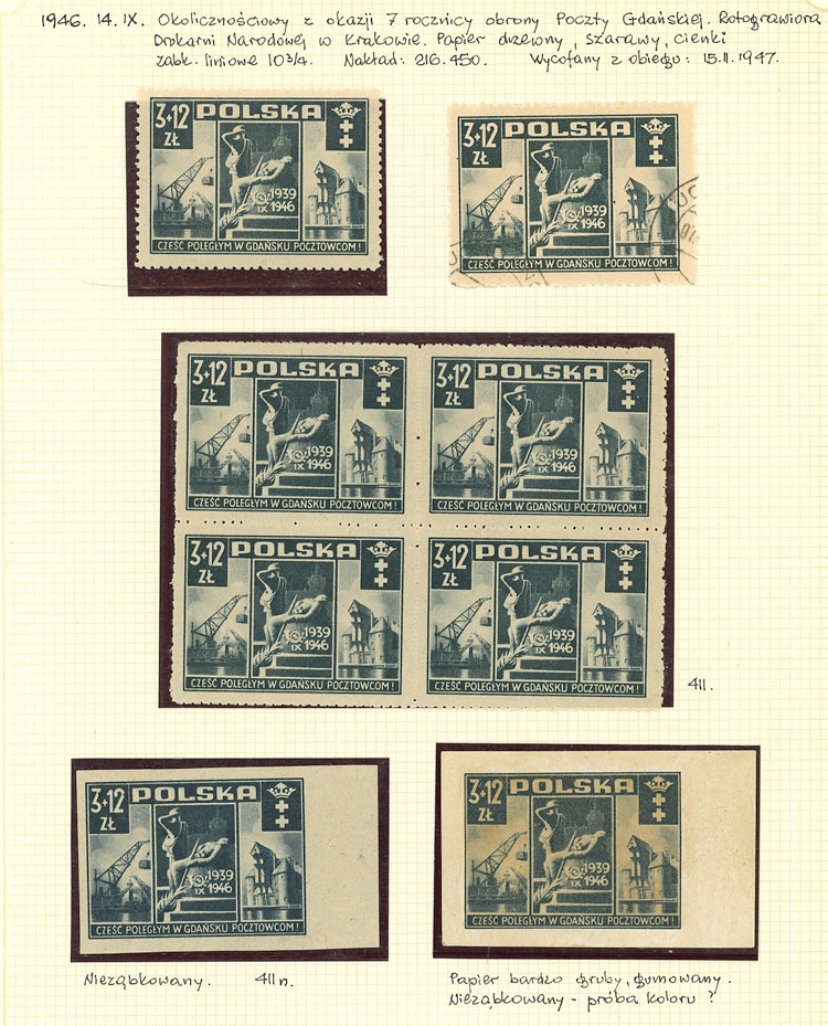 Yvert 471, 1946 Defence of Danzig post office, development of the issue on 3 album pages, including 2 imperforate examples with good sheet margin (MNH perfect), one with double perforation, etc, very good lot, excellent quality, good