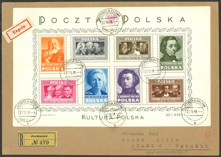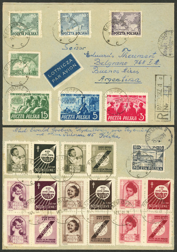 544/547, 1948 Fight againt Tuberculosis set of 4 values, block of 4 or 2 pairs of each value, with the advertising tabs attached + other stamps, franking a registered airmail cover sent from Raciborz to Argentina on 14/DE/1949, VF quality! (Image)