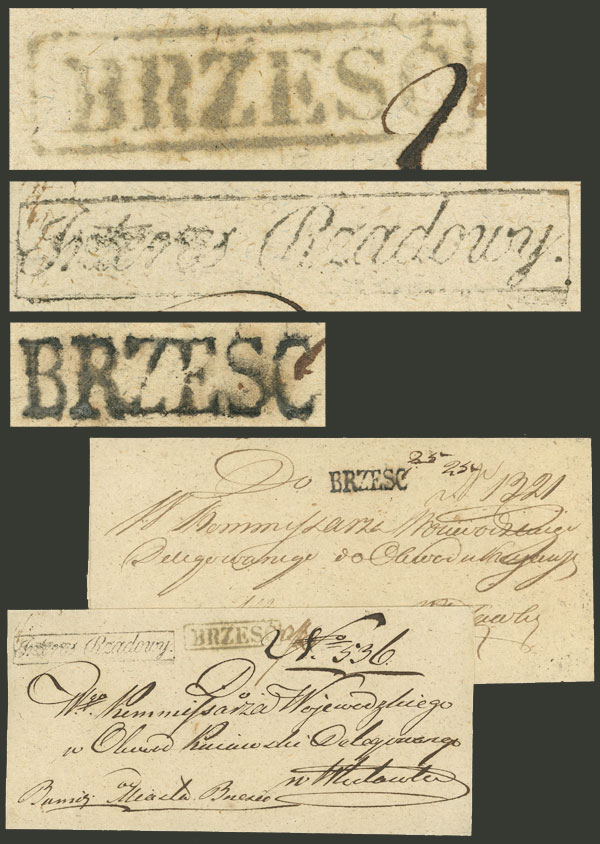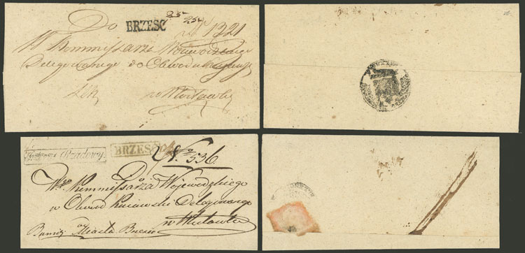 Couple of used folded covers (circa 1817/1858) with straightline marks of "BRZESC" with and without frame, excellent quality! (Image) (Image-02)