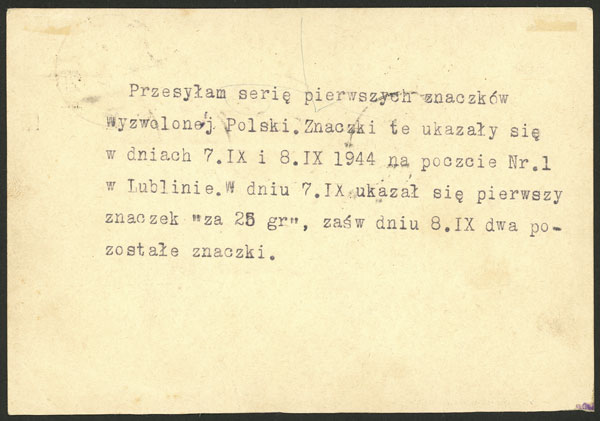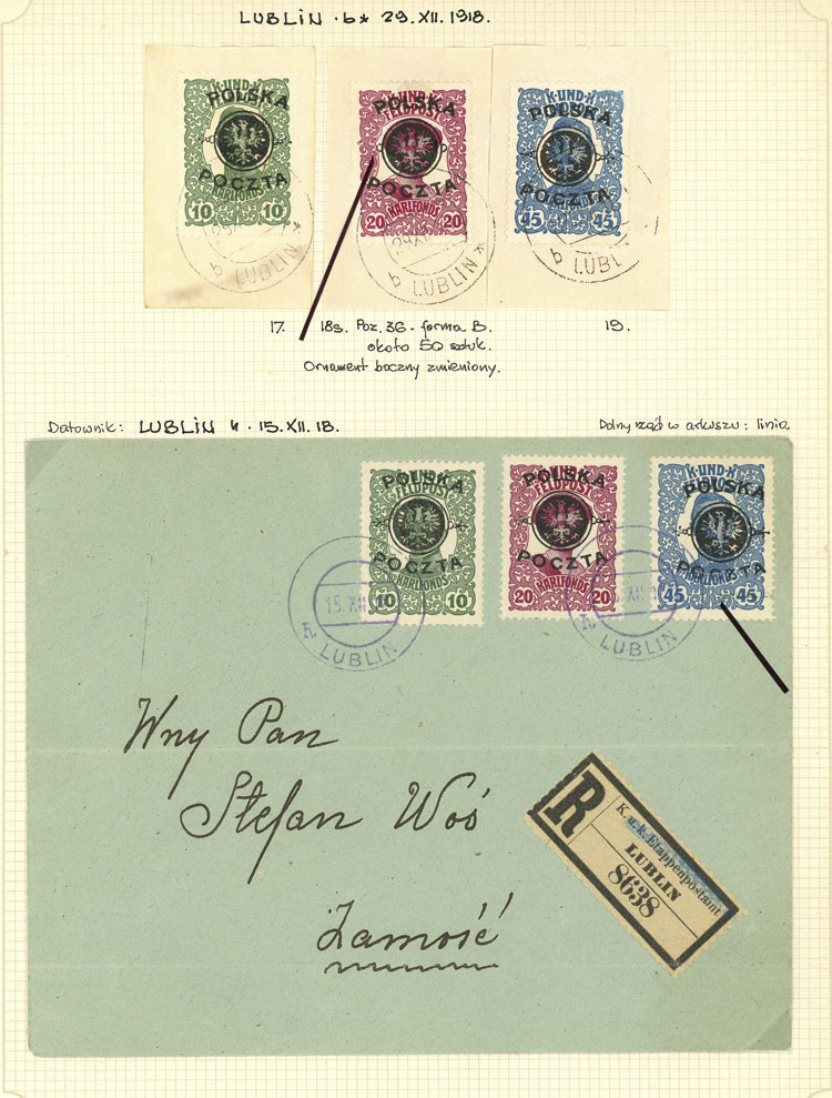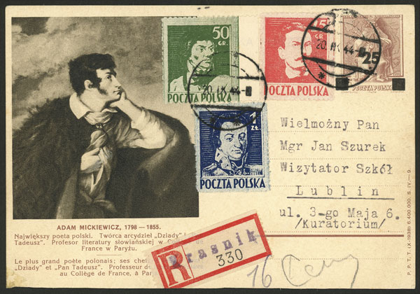 Yvert 427/429, 1944 Complete set of 3 values on a 25gr. postal card, sent by registered mail from Prasnik to Lublin on 20/SE/1944. The 1z. stamp with the variety corresponding to position 24, and the 50g. corresponds to position 5,