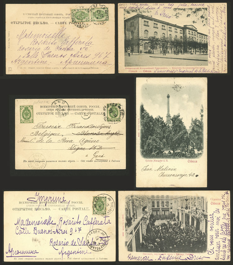 Fantastic postcards with views of Odessa sent to Belgium and Argentina (4) between 1899 and 1904, with Russian frankings and interesting postal marks, very attractive lot! ATTENTION: Please view all the photos of the lot, because all the content has