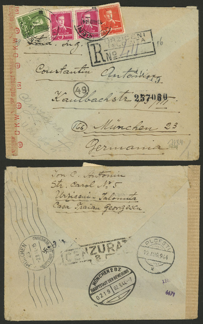 10/AU/1944 Urziceni-Talomita to Germany, registered cover with a number of Nazi censor marks (O.K.W.), we include a letter that I believe was sent before, written in Bucuresti on 2/JUL/1944, with Nazi marks and censored. The sender was