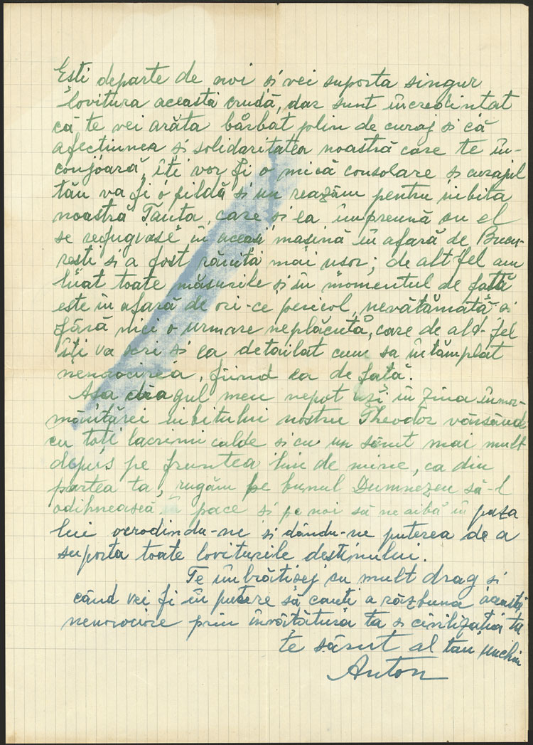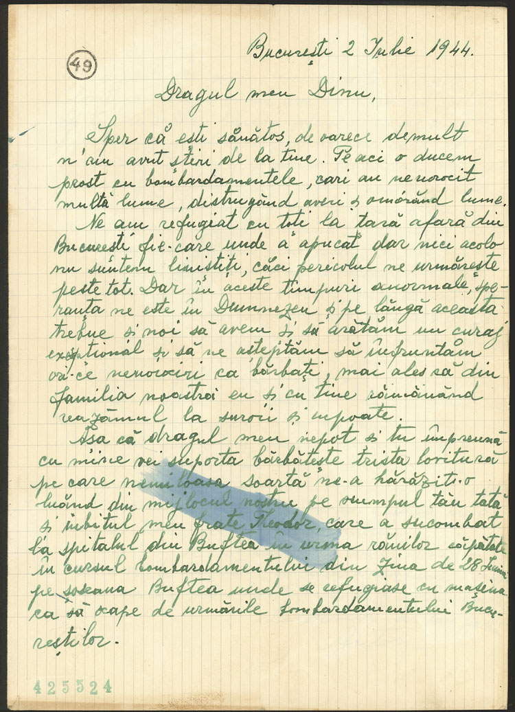 his uncle, and he writes about the bombings they were enduring in Bucharest, the destruction, and the death of his brother Theodor (the recipient´s father) a few days earlier as a result of a bombing on June 28 "on the road from Buftea, despite