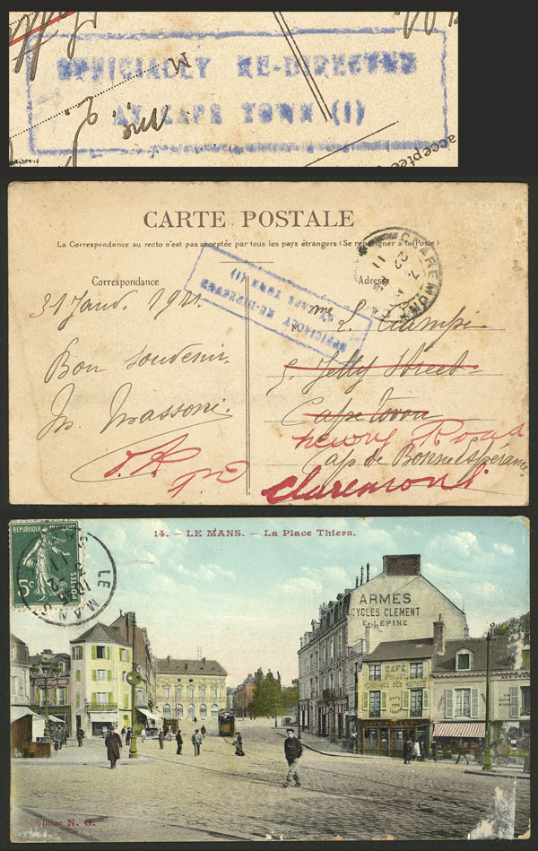 sent from France to Cape Town on 3/FE/1911, on 22/FE/1911 it was re-directed, receiving a datestamp and the blue mark "OFFICIALLY RE-DIRECTED / AT CAPE TOWN (1)", very fine quality! (Image)