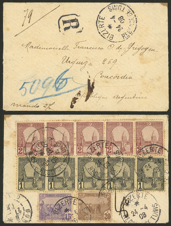DESTINATION: 24/AP/1908 Bizerte to Argentina, registered cover with nice franking on back (total 50c.), with 2 (light) arrival marks of Concordia over the Tunisian postage, excellent quality, rare! (Image)