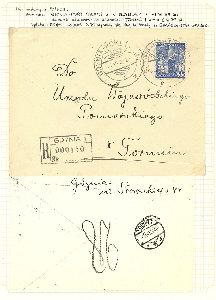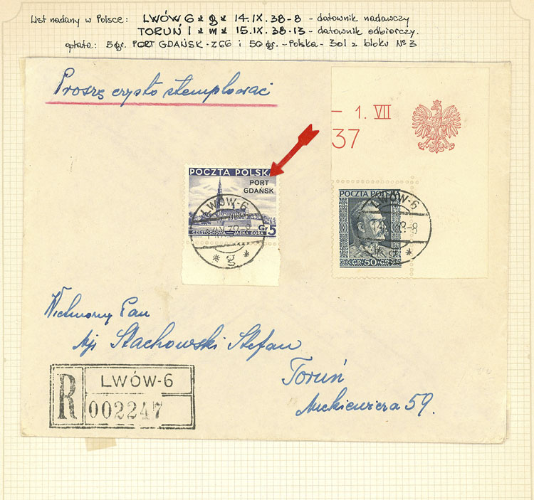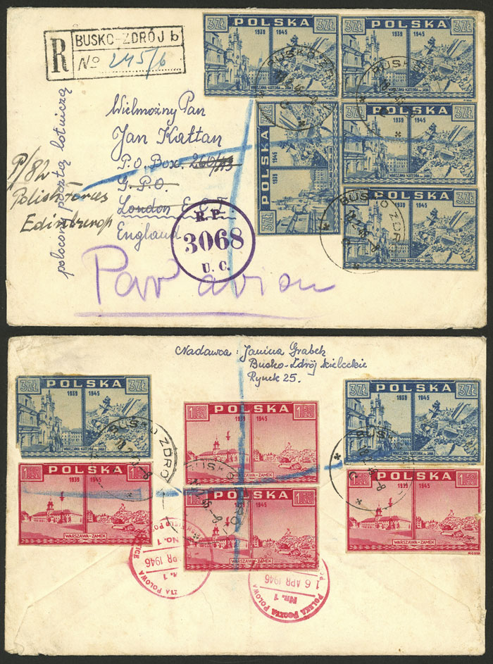 Registered airmail cover sent from Busko-Zdroj to England on 18/FE/1946 with fantastic postage on front and back, VF quality! (Image)