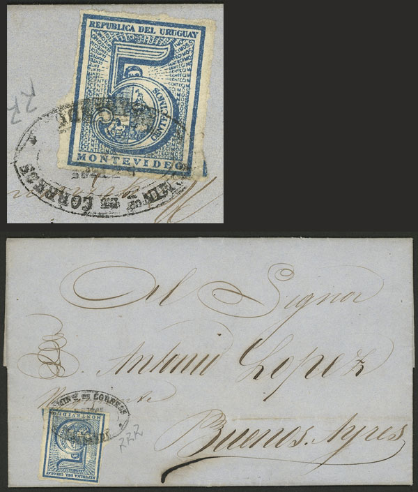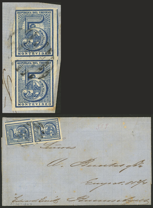 3/OC/1867 Montevideo to Buenos Aires, entire letter franked with pair of 5c. (Sc.30) with mute cancel, very fine quality! (Image)