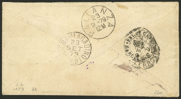 5c. Stationery envelope sent to Italy with due marking for insufficient postage, on arrival in Palanza on 23/SE/1879 it received postage due stamps for 55c., there are several transit marks and arrival on back, very fine quality, rare,