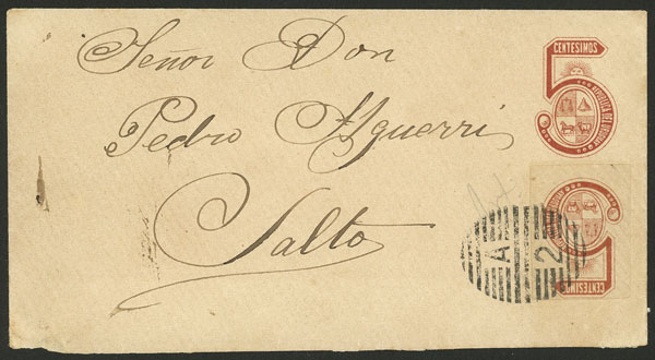 Ciardi ST5 envelope + additional postage of 5c. (cut out from a similar envelope) cancelled by semi-mute "A-2" barred oval to complete the 10c. rate, sent to Salto, excellent quality, rare, ex-Loeb (selling price was US$2,500) (Image) (Image-02)