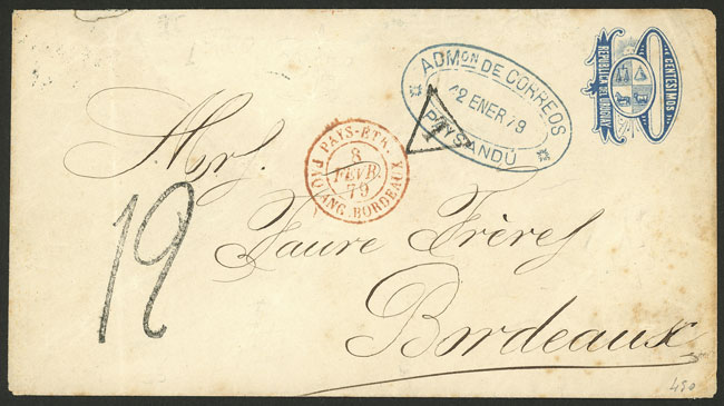 10c. Stationery envelope sent from Paysandú to France on 12/JA/1879, with due marks and Bordeaux arrival, very fine quality, ex-Loeb (selling price was US$450)