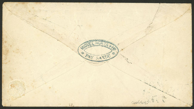 Stationery envelope with spelling mistake "CENTECIMOS" + additional 40c. on back (pair Sc.38) sent by registered mail from MERCEDES to Montevideo on 5/AP/1874, excellent quality, rare, ex-Loeb (selling price was US$3,500) (Image)