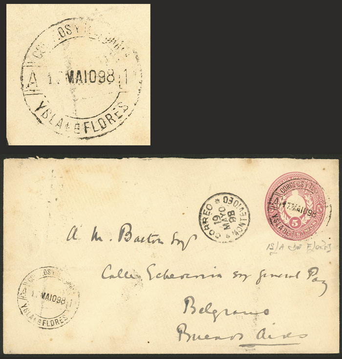 5c. Stationery envelope sent from YSLA DE FLORES to Buenos Aires on 17/MAY/1898, with transit mark of Montevideo and arrival (on back), very fine quality!