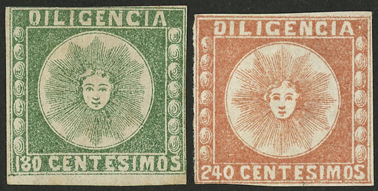 proofs of the stamps for envelopes issued in 1866 with spelling mistake (CENTECIMOS), 5c. in dark sky bue and rose-red + 10c. green, the 3 of excellent quality, rare lot!