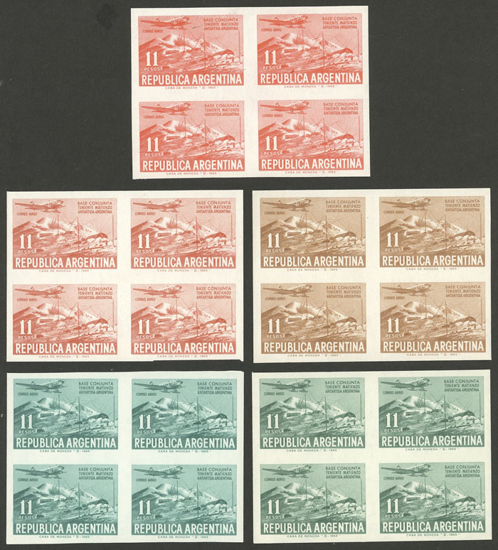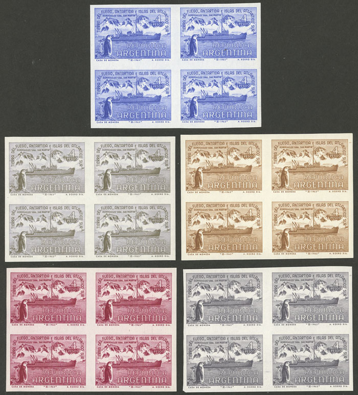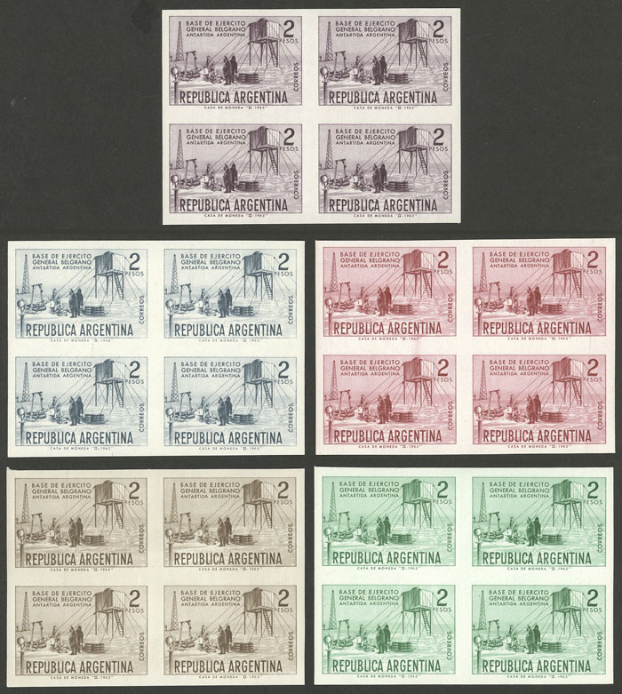 1965 Gral. Belgrano Antarctic base, IMPERFORATE BLOCK OF 4 + other 4 imperf blocks of 4 in different colors (color proofs), MNH, excellent quality! (Image)