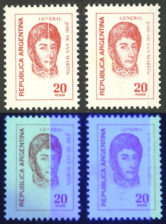 the stamp) with the normal phosphorescent paper (end of the patch). These examples occured because during printing, the roll of paper being used (phosphorescent) finished, and in order to join it with another roll, they used a patch of fluorescent