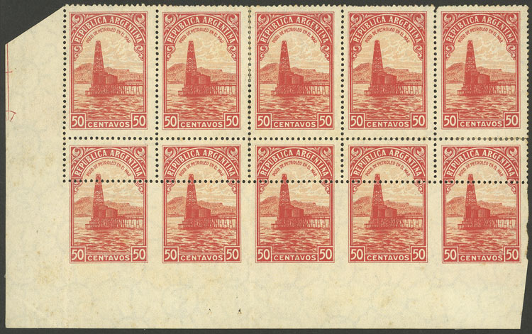 50c. Oil well, corner block of 10, the bottom stamps almost completely IMPERFORATE (value of an imperf pair US$500!!), with minor defects on gum but excellent front, very rare, spectacular! (Image)