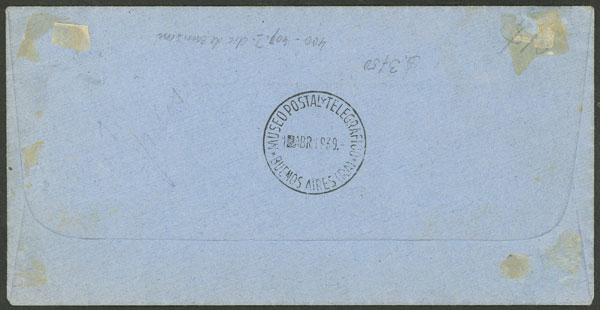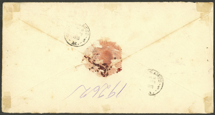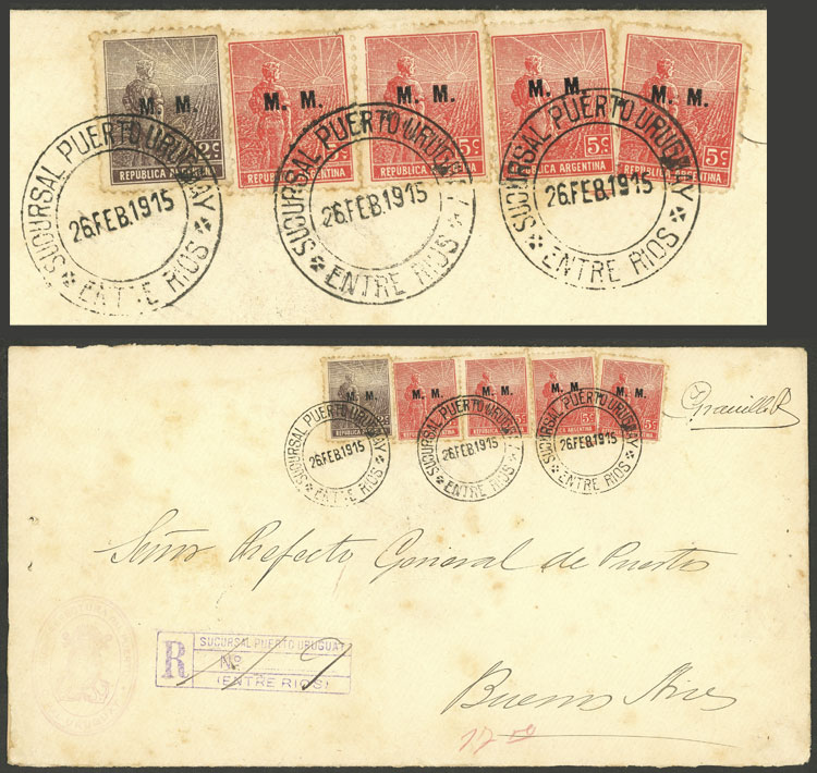 Registered official cover sent from SUCURSAL PUERTO URUGUAY (Entre Ríos) to B.Aires on 26/FE/1915, franked with 25c. and very well cancelled, arrival backstamp, VF qulaity, rare! (Image) (Image-02)