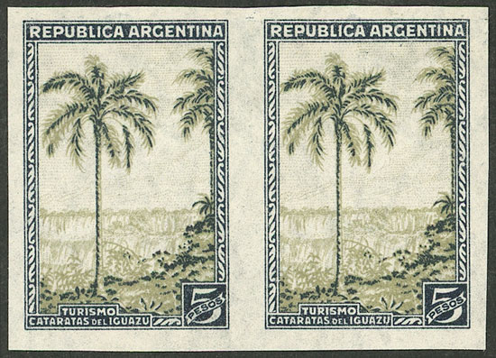 5P. Iguazú falls, straight rays wmk, IMPERFORATE PAIR, MNH (+30%), excellent quality! (Image)