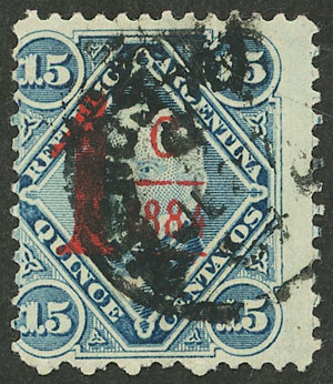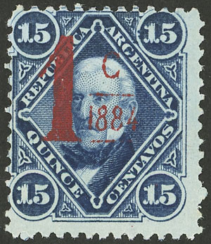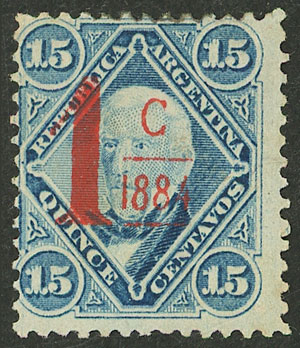 1c on 15c. vermilion overprint, with VARIETY: no line below "1884" (Image)