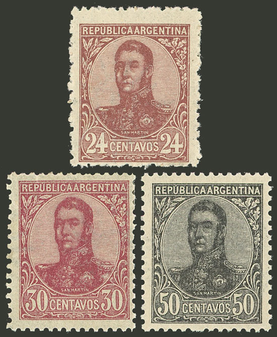 GJ.275/287 + 289/299, San Martín in oval (complete set with both perforations, not including the UNISSUED value, 1c. blue), 24 values, all of VF quality