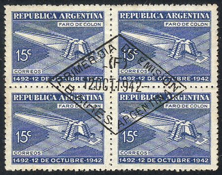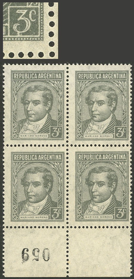 block of 4 with numbered sheet margin, one with VARIETY: "3" with cedilla (Image)