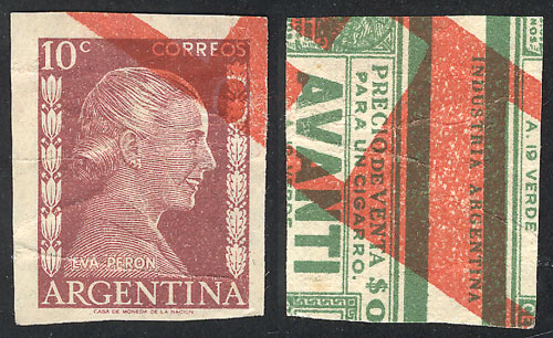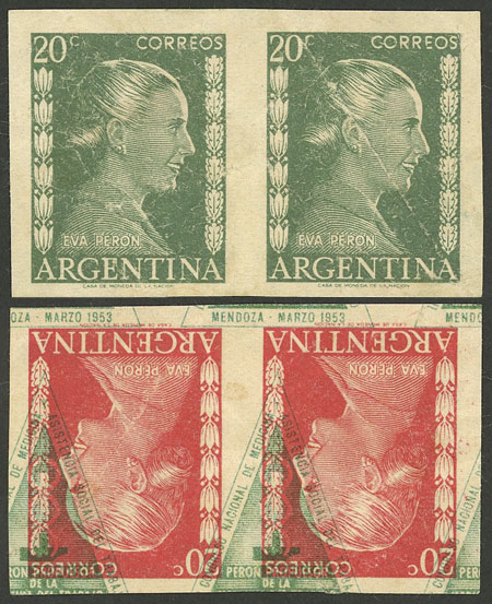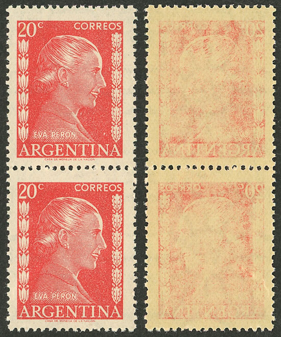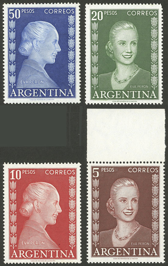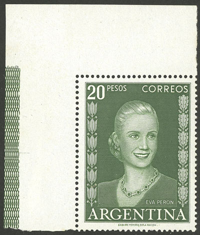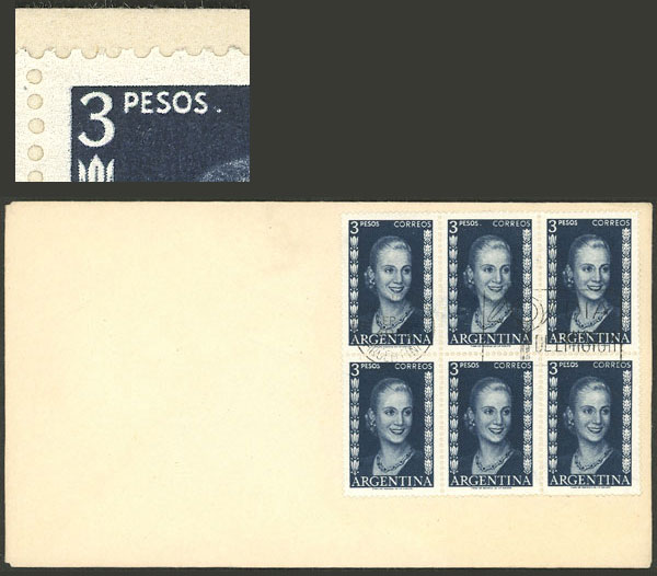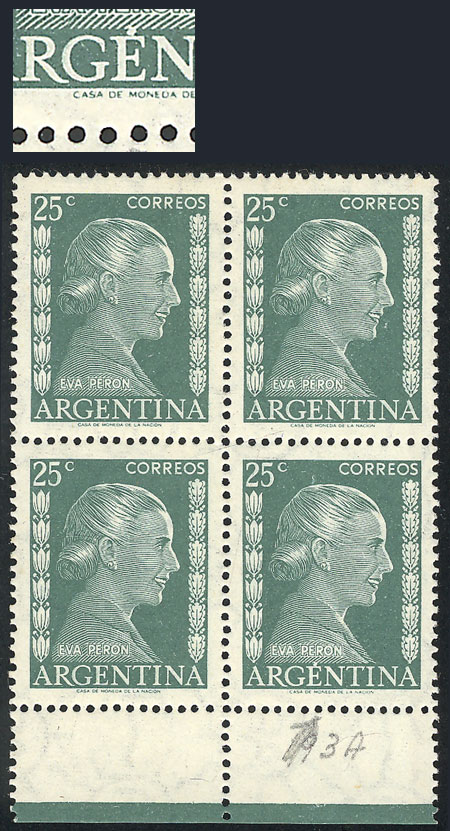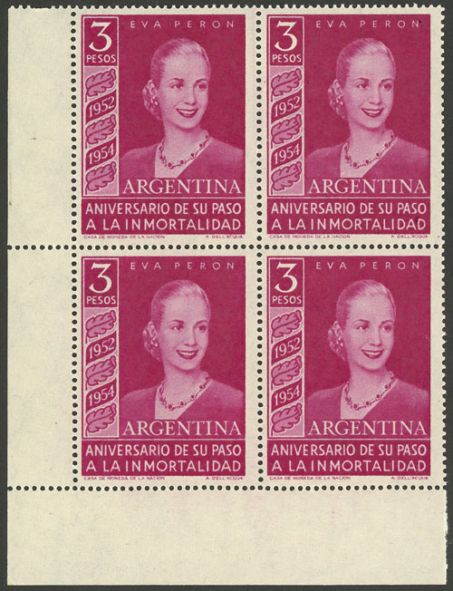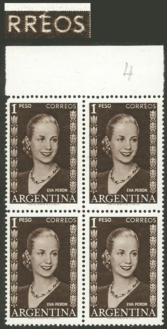 Eva Perón, marginal block of 4, one with VARIETY: plate flaw over the "E" of CORREOS (Image)