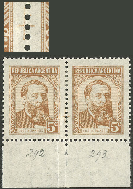 marginal pair, with VARIETY: Perforating guide lines between the stamps (Image)