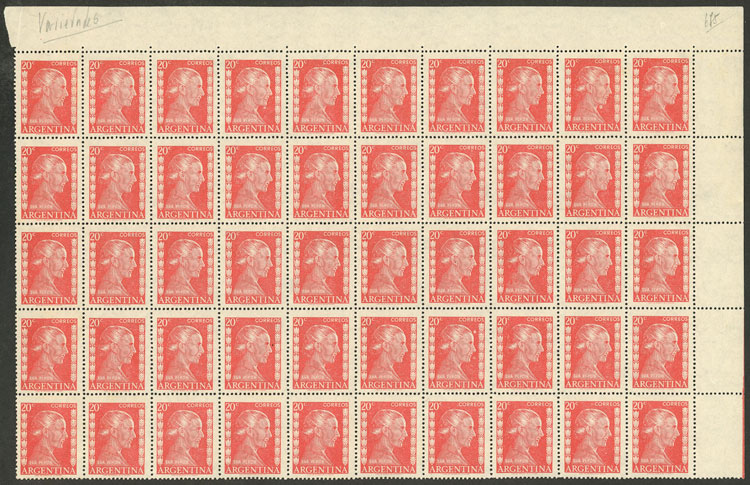 GJ.1006A, 20c. Eva Perón, large corner block of 50, at first sight there are VARIETIES, spots below the chin and in front of the forehead, excellent quality