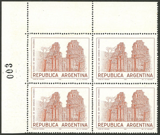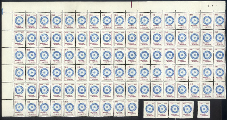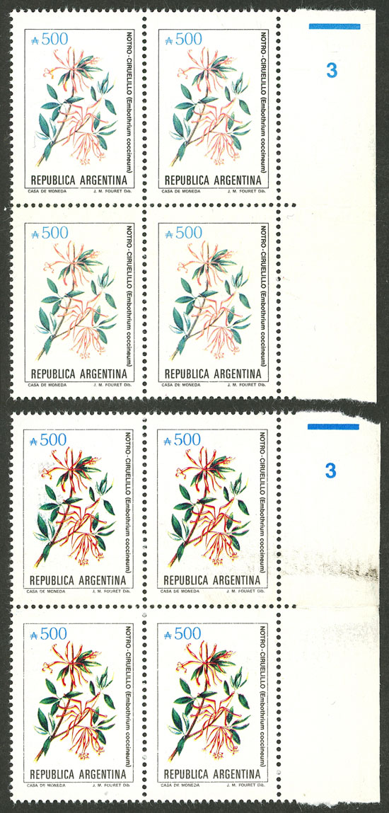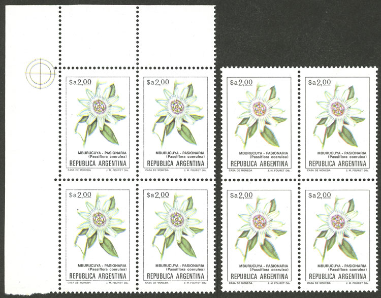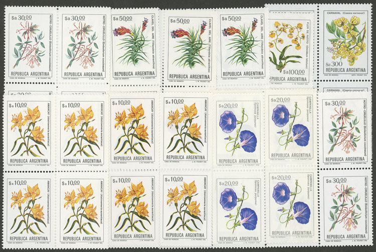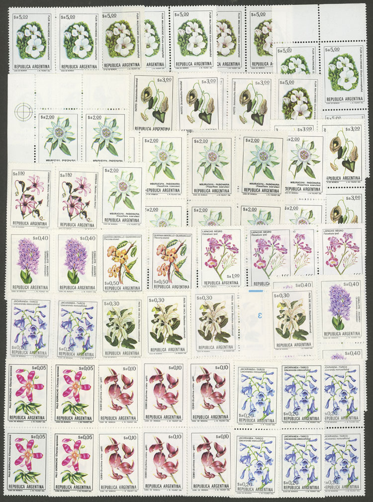 GJ.2107/2115, Flowers (in Pesos Argentinos), complete set of 17 values, including ALL the catalogued VARIETIES and MANY MORE uncatalogued!! In total 48 blocks of 4, all of excellent quality, for example: GJ.2101 + GJ.2101A in different