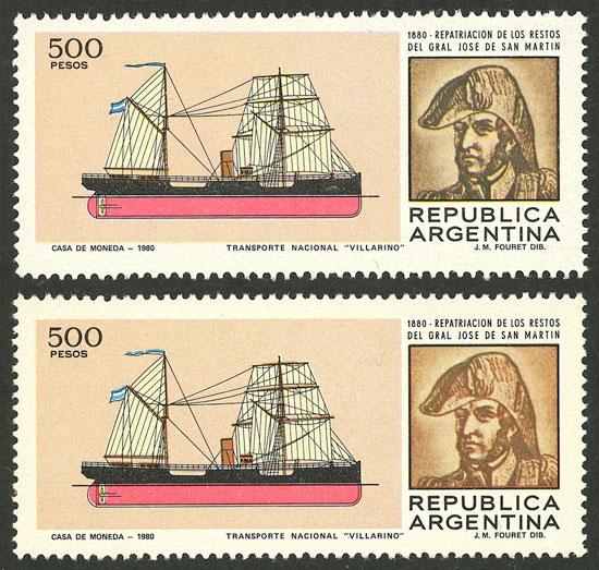 Ship, 2 stamps in different shades, San Martin in light + dark brown (Image)