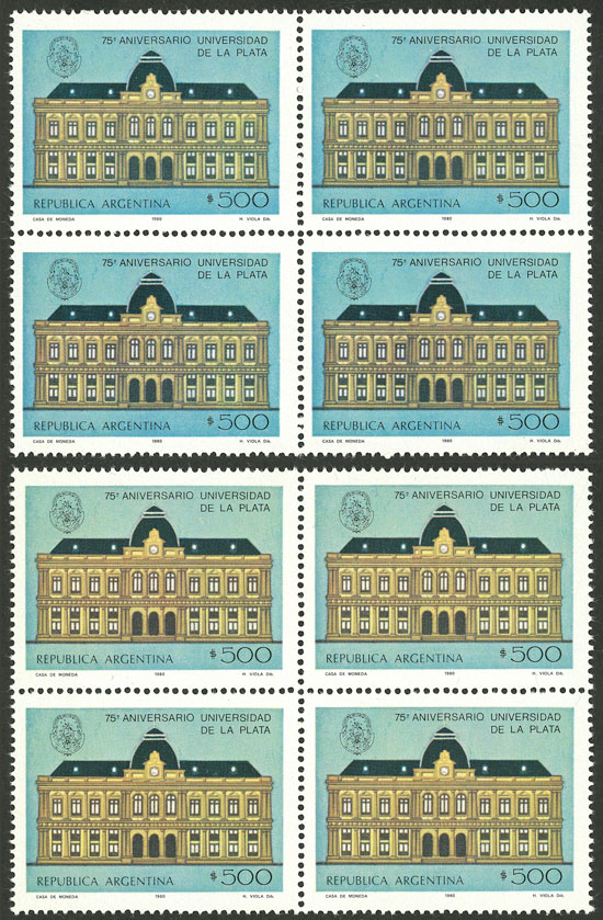2 blocks of 4 from VERY different printings, with backgrounds in different shades: greenish blue + yellowish light blue (Image)