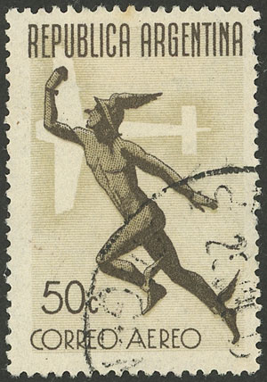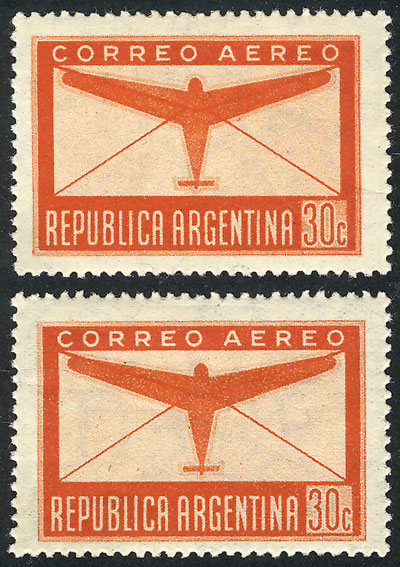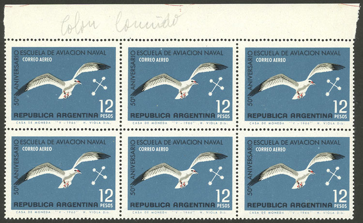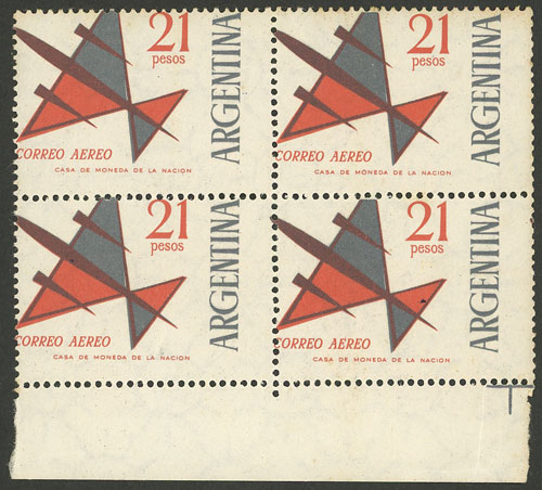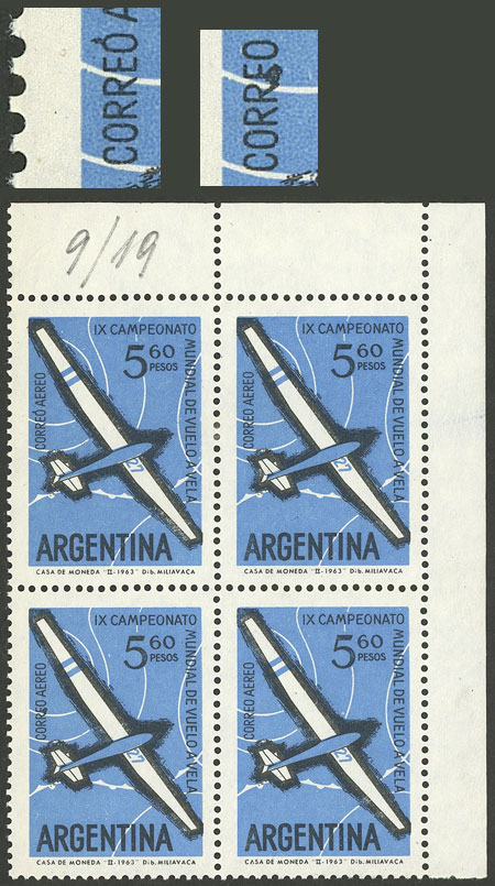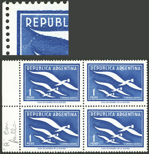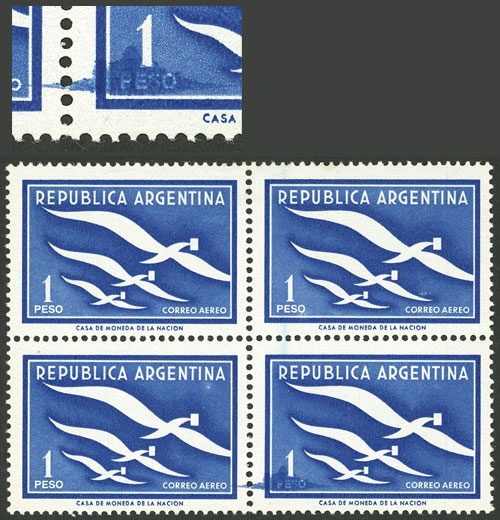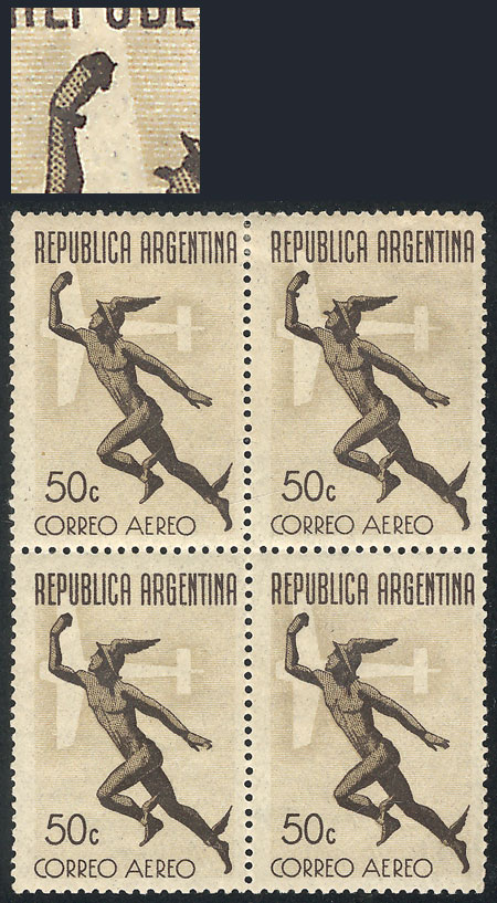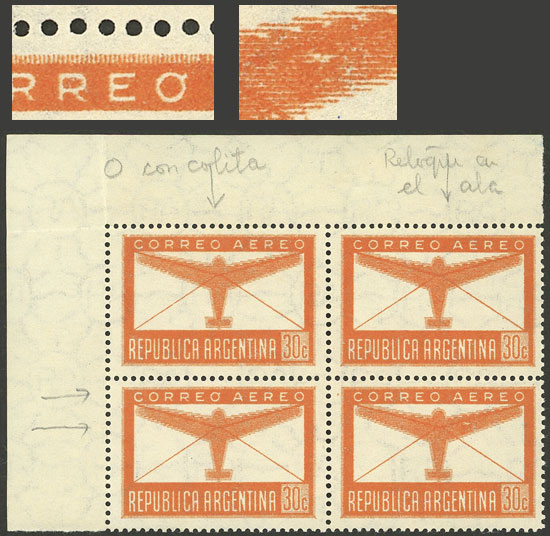 corner block of 4, the bottom stamps with VARIETY: Left one, second "O" of CORREO with curl, and right one, retouch on the wing (Image)
