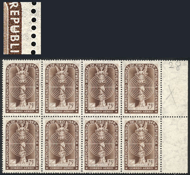 marginal block of 8, one with VARIETY: "U" of REPĂBLICA with horiz line resembling a lyre (pos.28), VF (Image)