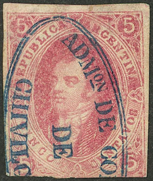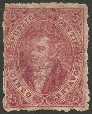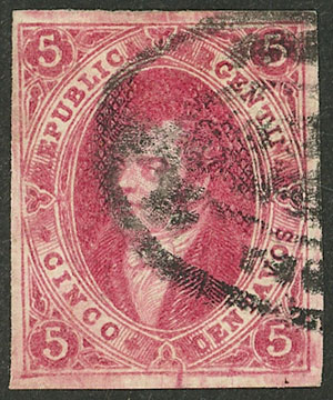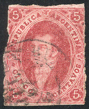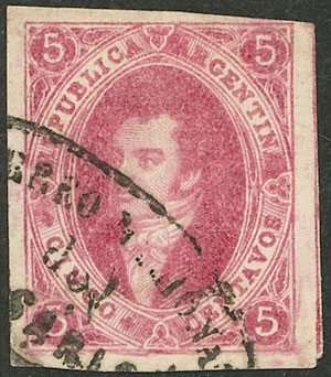 5c. 4th printing, LILAC-ROSE, mulatto, with wreathed double circle cancel of Santiago del Estero (+200%), small faults, rare! (Image)