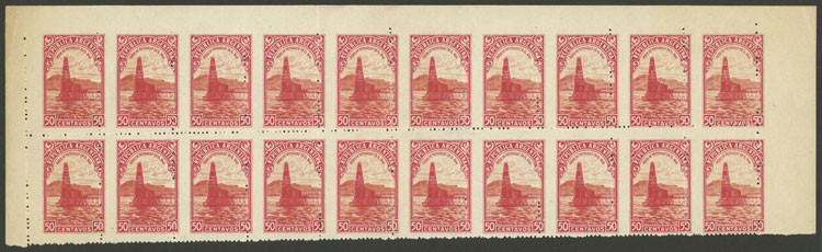 50c. Oil well at sea, large block of 20 (top part of the sheet) IMPERFORATE at top. Also the vertical perforations are shifted towards the left and run over the right face value of each stamp, MNH, excellent quality, very rare! (Image)
