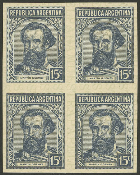 15c. Martín Güemes, PROOF in the issued color, imperf block of 4 printed on special paper for specimens, VF quality! (Image)