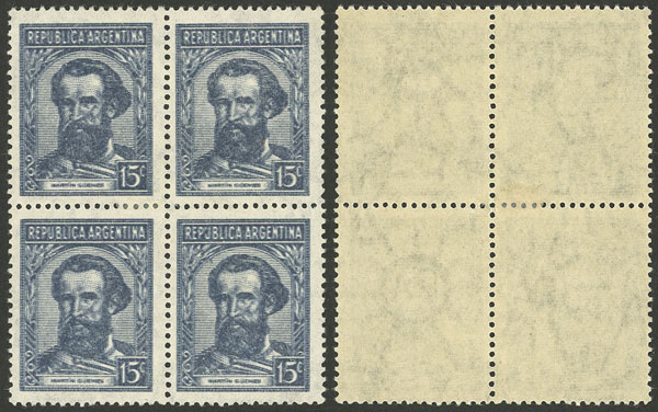 15c. Güemes, block of 4 with DOUBLE IMPRESSION variety, neat straight rays wmk, excellent quality, rare! (Image)