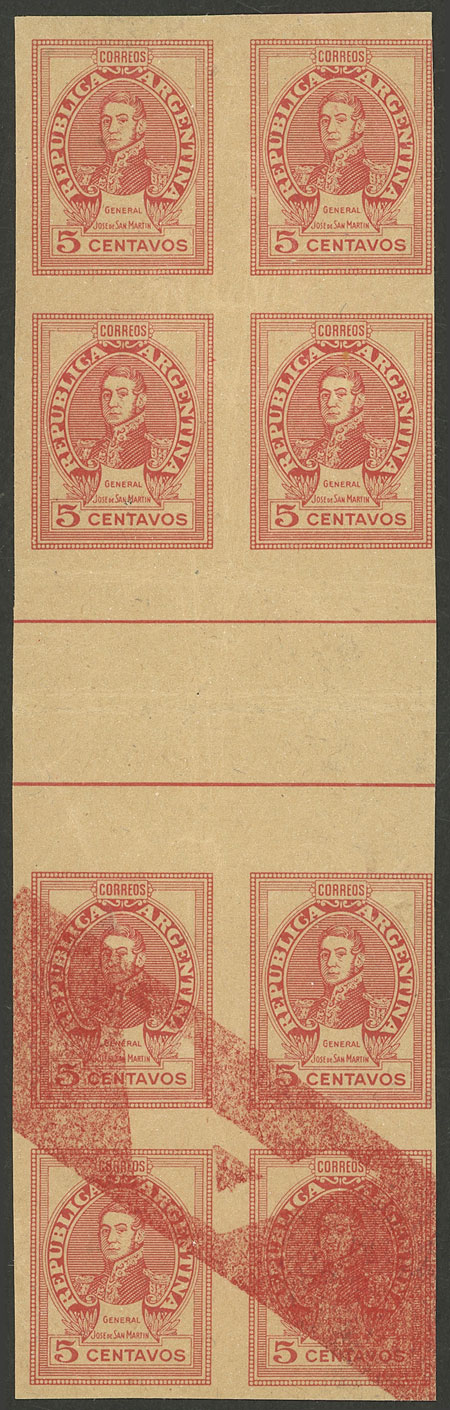 1942/52 5c. San Martín, proof in the issued color printed on paper for specimens, block of 8 stamps with horizontal GUTTER, some light creases as usual for these proofs, very fine quality, rare! (Image)