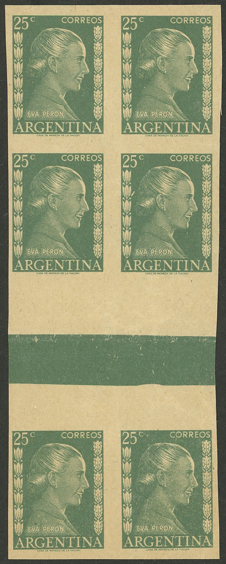 1952 25c. Eva Perón, proof in the issued color printed on paper for specimens, block of 6 stamps with horizontal GUTTER, very fine quality, rare!! (Image)