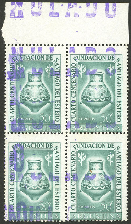 1953 Santiago del Estero (jar), block of 4 with "ANULADO" ovpt., probably applied when some balance of postage was withdrawn from circulation, very interesting!