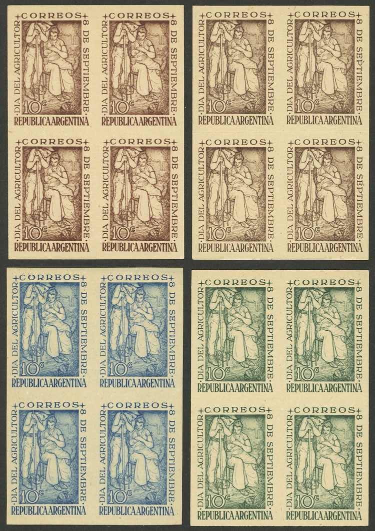 1948 Farmers' day, 4 different COLOR PROOFS in imperforate blocks of 4, VF quality! (Image)