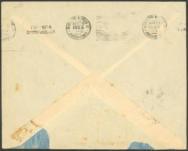 RARE POSTAGE: Registered airmail cover sent from B.Aires to USA on 27/JUL/1953 with fantastic franking of 143.30P. that includes 6x 20P. Eva Perón (GJ.1021) + other values of the same issue, with arrival backstamp of 31/JUL. One 10c.