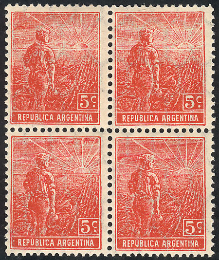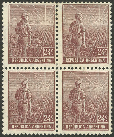 24c. Plowman, Italian paper with vertical honeycomb wmk, perf 13¼x12½, block of 4, VF (Image)