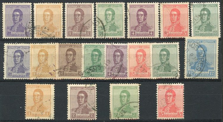 GJ.423/429 + 430/437 + 438/441, 1917 San Martín with vertical honeycomb watermark, both perforations (in total 15 values) + horizontal honeycomb with perf 13¼x12½ (4 values), used, VF (Image)